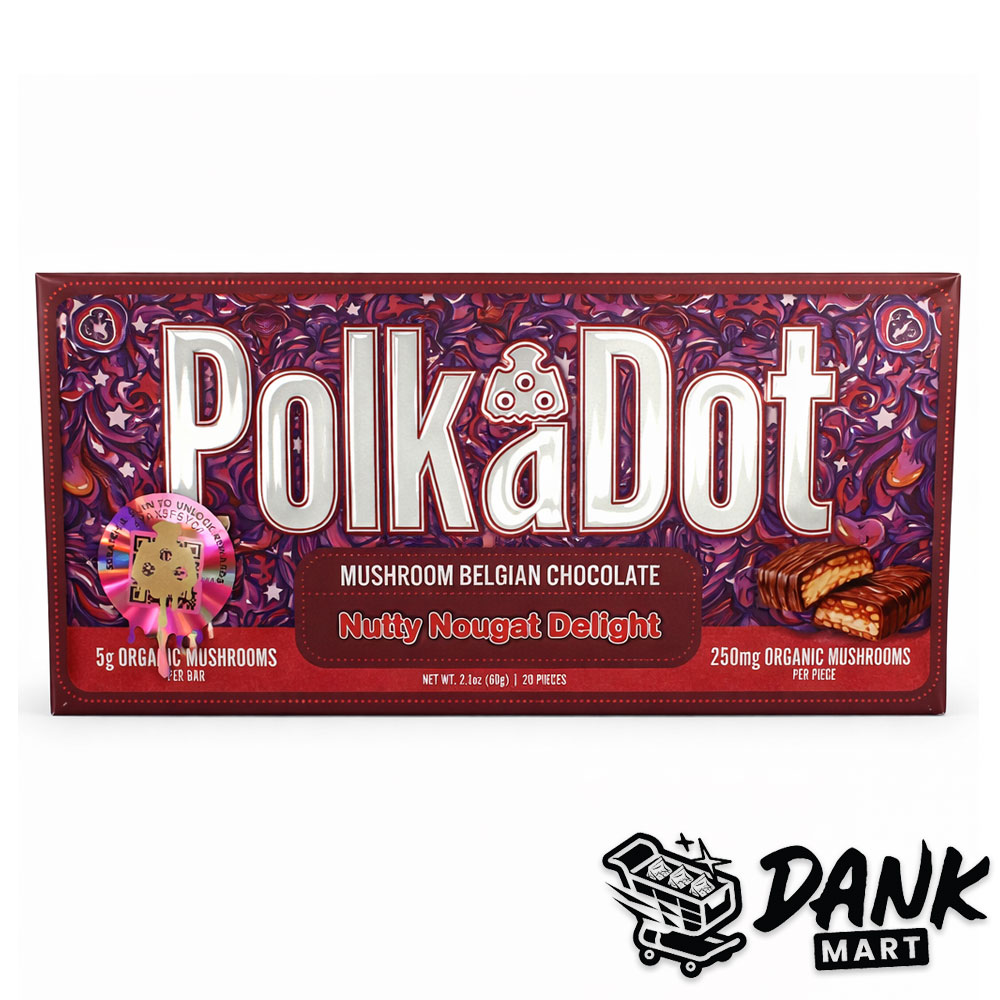 Explore the refined fusion of flavor and experience with PolkaDot Mushroom Belgian Chocolate – Nutty Nougato Delight, available now at DankMart.co.