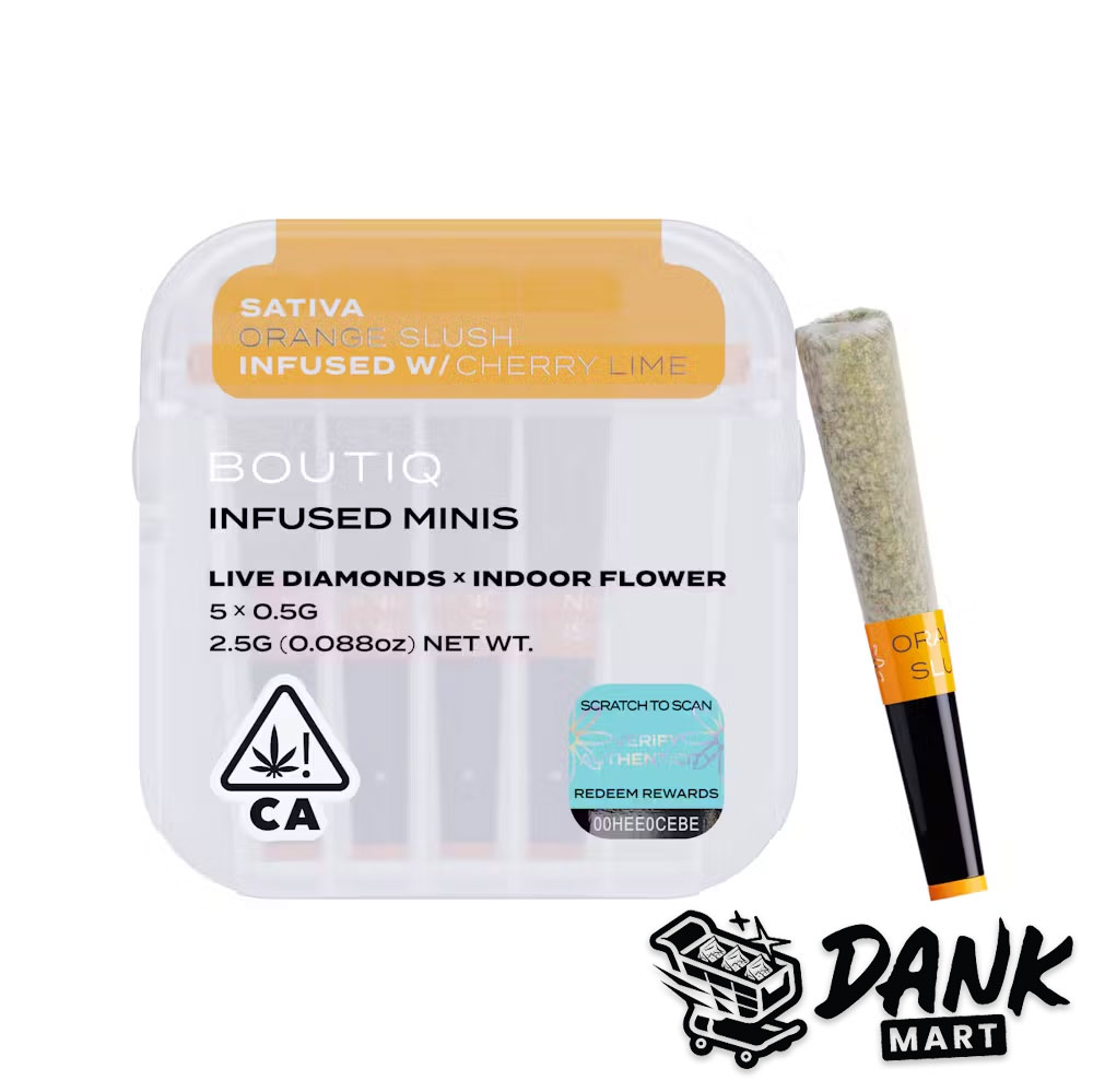 Discover your new favourite infused pre-roll experience with Boutiq Live Diamond Minis (5 x 0.5g) – Orange Slush Infused w/Cherry Lime, now available at Dank Mart. Crafted for cannabis lovers who crave vibrant flavour, smooth smoke, and premium potency, these minis deliver a refreshing, fruit-forward escape in every session. If you’re searching to buy Boutiq Live Diamond Minis (5 x 0.5g) – Orange Slush Infused w/Cherry Lime online in the USA, you’ve just found the perfect place.